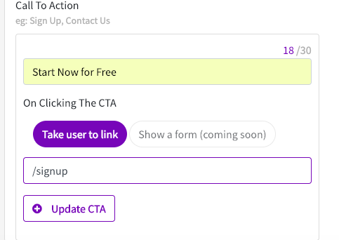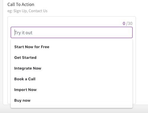 4. Under **Call To Action**, write the text you wish to show the user (example "Sign Up" or "Learn More"). You can also choose a text from the dropdown list that appears automatically.\