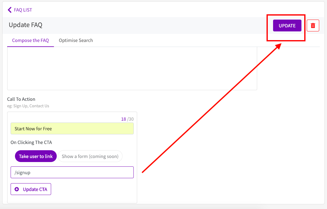 6. Click **Update CTA** to save. Then go to top right and click "**Update**". This will save the FAQ.\